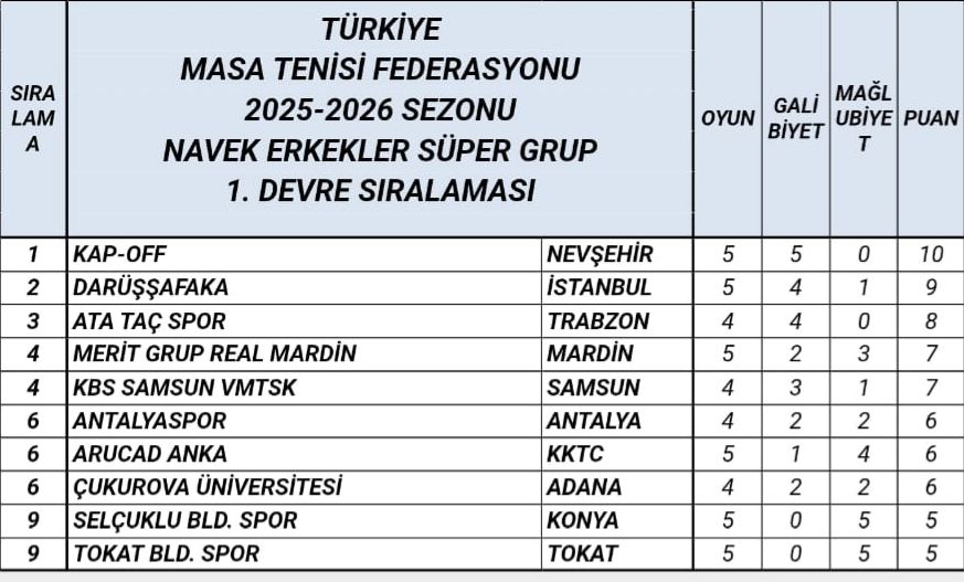 Türkiye Masa Tenisi Federasyonu tarafından 18-19-Ekim 2025 tarihleri arasında İstanbul Tozkoparan Spor Salon'unda düzenlenen Navek Süper Grup 1.Etap müsabakalarında, Nevşehir Kapoff takımımız 5'te 5 yaparak ligde nağmalup olarak yoluna devam ediyor. Takımımızı İlimize yaşatmış oldukları gururdan dolayı tebrik eder, başarılarının devamını dileriz.