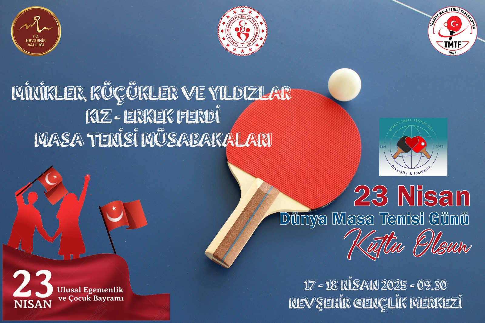 17-18/04/2025 tarihlerin' de Gençlik Merkezi spor salonunda, 23 Nisan Ulusal Egemenlik ve Çocuk Bayramı etkinlikleri kapsamında Kız-Erkek Ferdi Masa Tenisi turnuvası düzenlenecektir. Tüm ilkokul ve ortaokul öğrencilerimiz davetlidir.