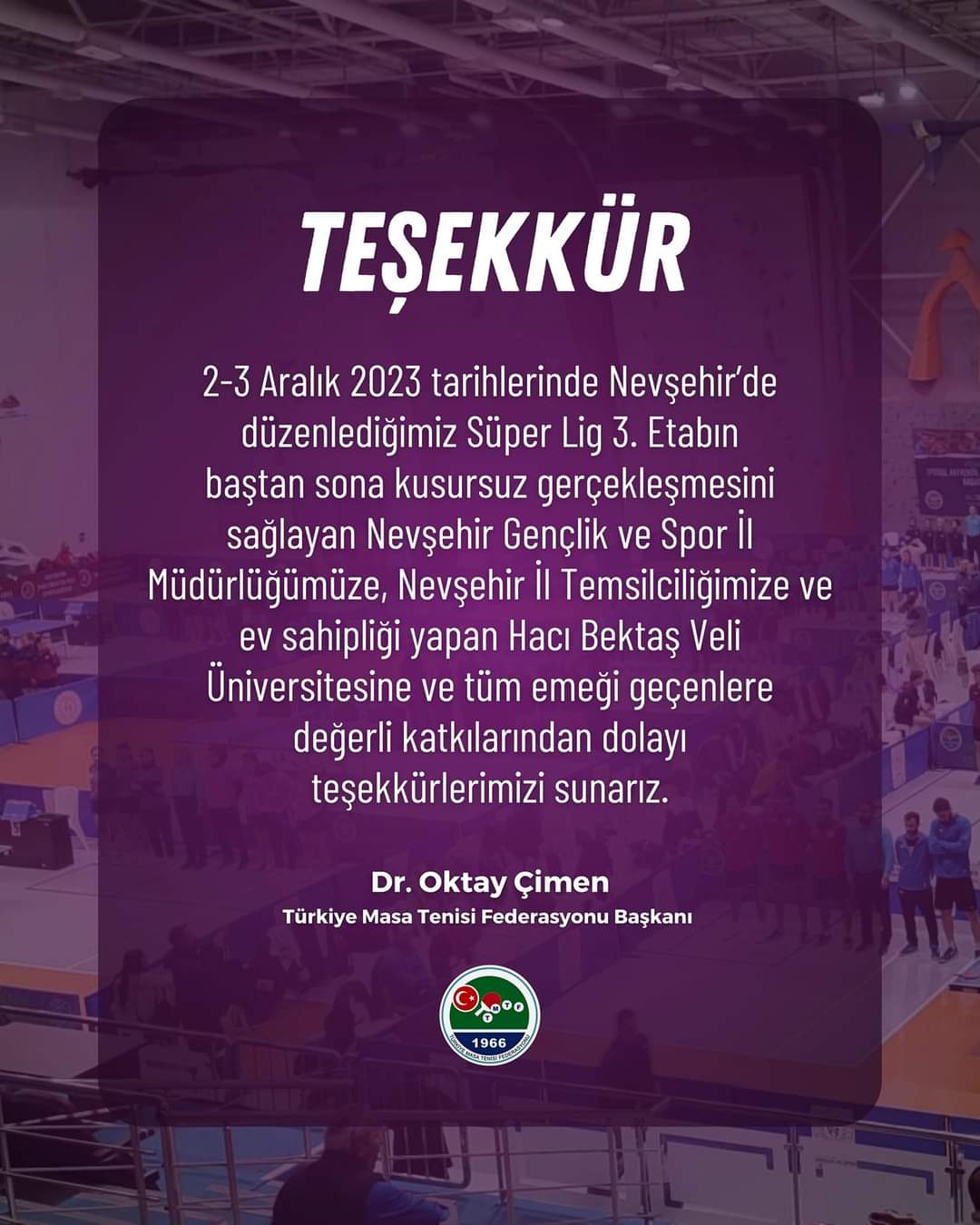 İlimizde yapılan Süper lig 3. etap müsabakaları bitiminde Federasyon Başkanımız Sayın Dr. Oktay ÇİMEN tarafından bir teşekkür mesajı yayımlandı. Bizde katılımlarından dolayı kendilerine, müsabakaların düzenlenmesinde emeği geçen herkese ve izlemeye gelen tüm sporseverlere Nevşehir Masa Tenisi İl Temsilciliği olarak teşekkürlerimizi iletiyoruz.