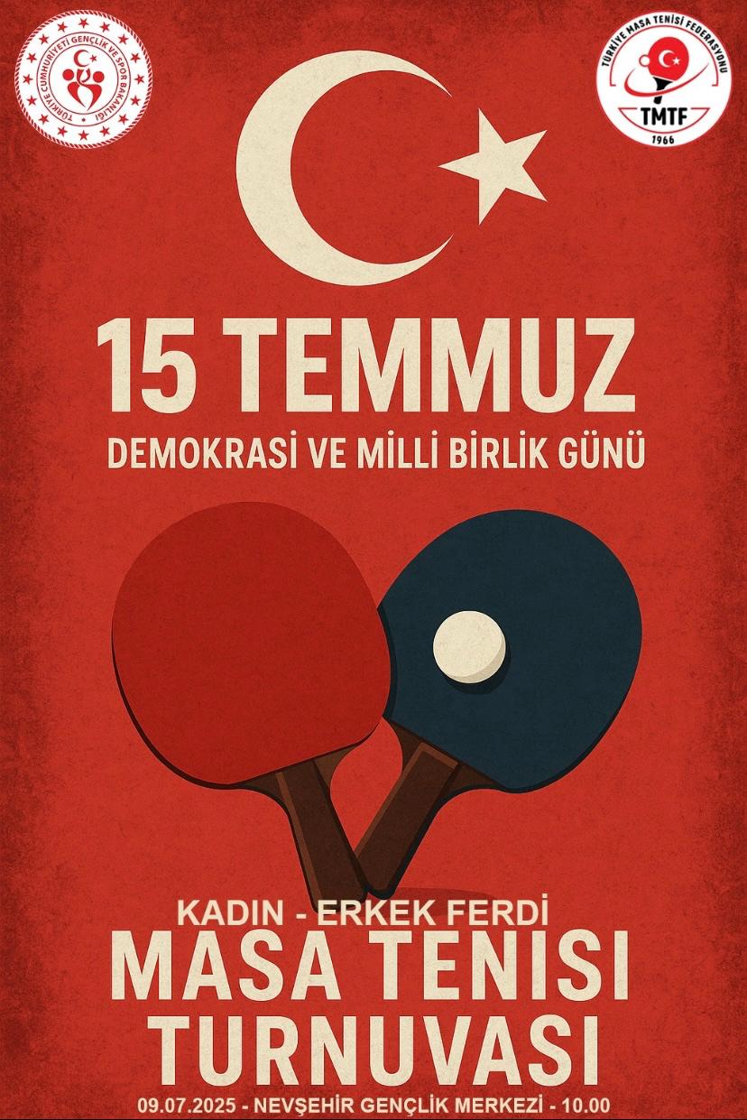 15 Temmuz Demokrasi ve Milli Birlik Günü kapsamında tüm halkımıza yönelik Ferdi Masa Tenisi turnuvası 09.07.2025 tarihinde saat 10.00'da Gençlik Merkezi Spor Salonunda yapılacaktır.