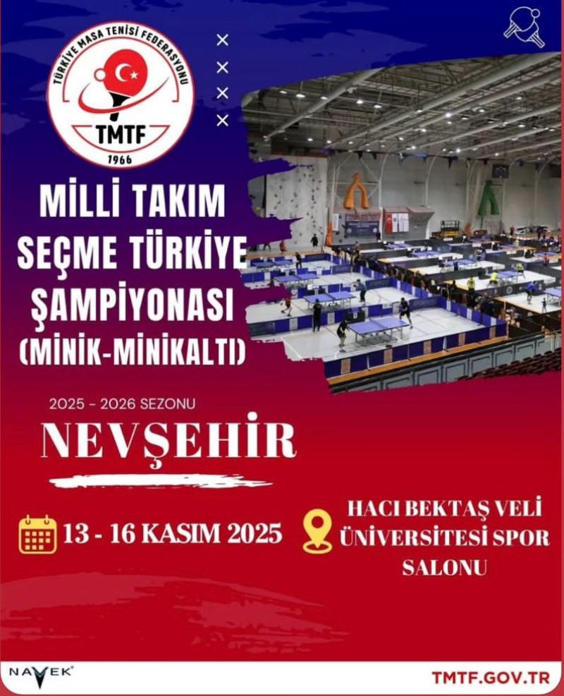 Navek Milli Takım Seçme Türkiye Şampiyonası Minik ve Minik Altı Masa Tenisi Müsabakaları, 13-16 Kasım 2025 tarihleri arasında Nevşehir Hacı Bektaş Veli Üniversitesi Spor Salonu’nda yapılacaktır.